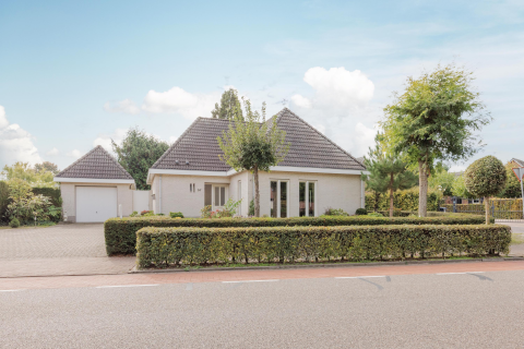 Aansluitend vind je een ruime aanbouw met twee lichtkoepels, inbouwspots en een doorlopende houten vloer vanuit de woonkamer. Dankzij de grote schuifpui valt er volop natuurlijk licht naar binnen en geniet je van een prachtig uitzicht over de tuin.